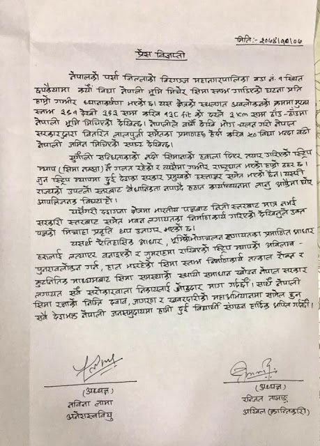 अनेरास्ववियूकी अध्यक्ष नबिना लामा र अनेरास्ववियू क्रान्तिकारीका अध्यक्ष रञ्जित तामाङले एक विज्ञप्ति जारी गर्दै वीरगञ्ज महानगरपालिका वडा नम्बर १ स्थित छपकैयामा नेपाली भूमि मिछेर सीमा स्तम्भ गाडिएको अवलोकनका क्रममा पाइएको उल्लेख गरेका छन् ।