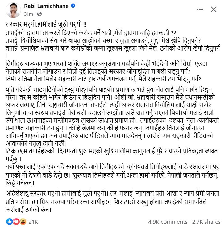 काठमाडौं । राष्ट्रिय स्वतन्त्र पार्टी (रास्वपा) का सभापति रवि लामिछानेलाई पक्राउ पुजी जारी भएप्छि उनले सरकार मरेको प्रतिक्रिया दिएका छन् ।