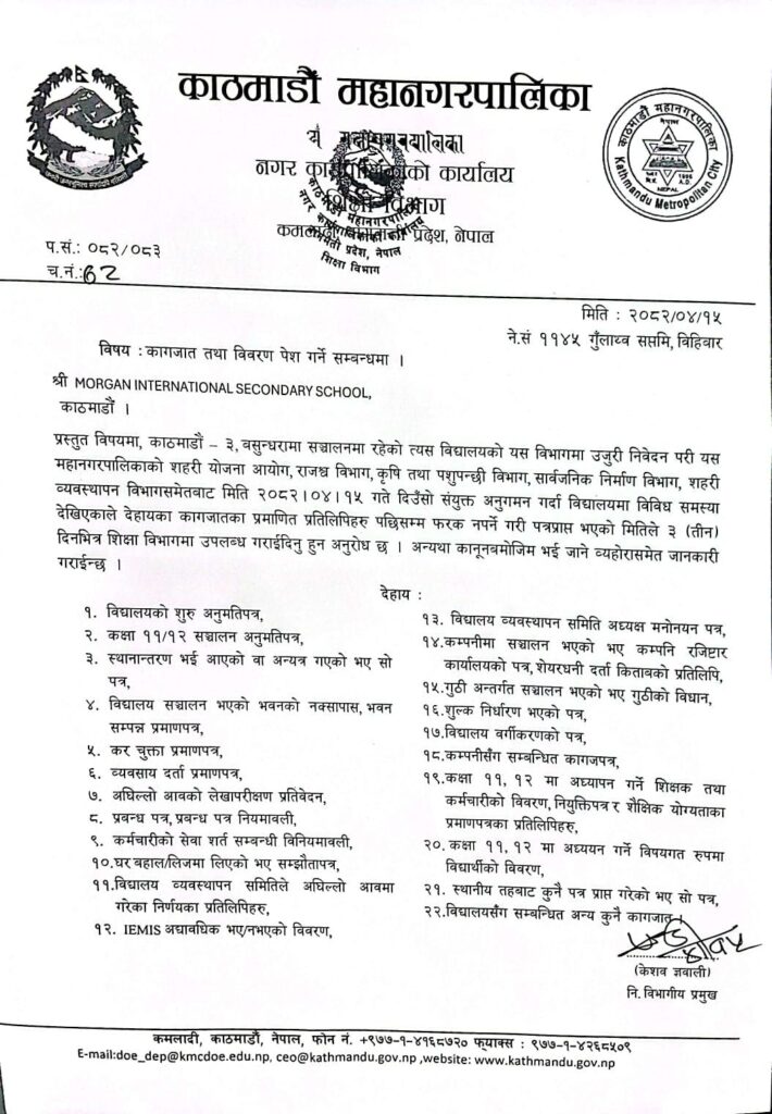 कलेजका सम्पूर्ण कागजात महानगरले माग गरेको छ । उक्त दिनको घटना हेर्दा महानगरपालिकाका कर्मचारीले बदलाको भावमा निर्णय गर्ने त हैनन् भनेर शंका गर्ने ठाउँ पनि भेटिन्छ ।