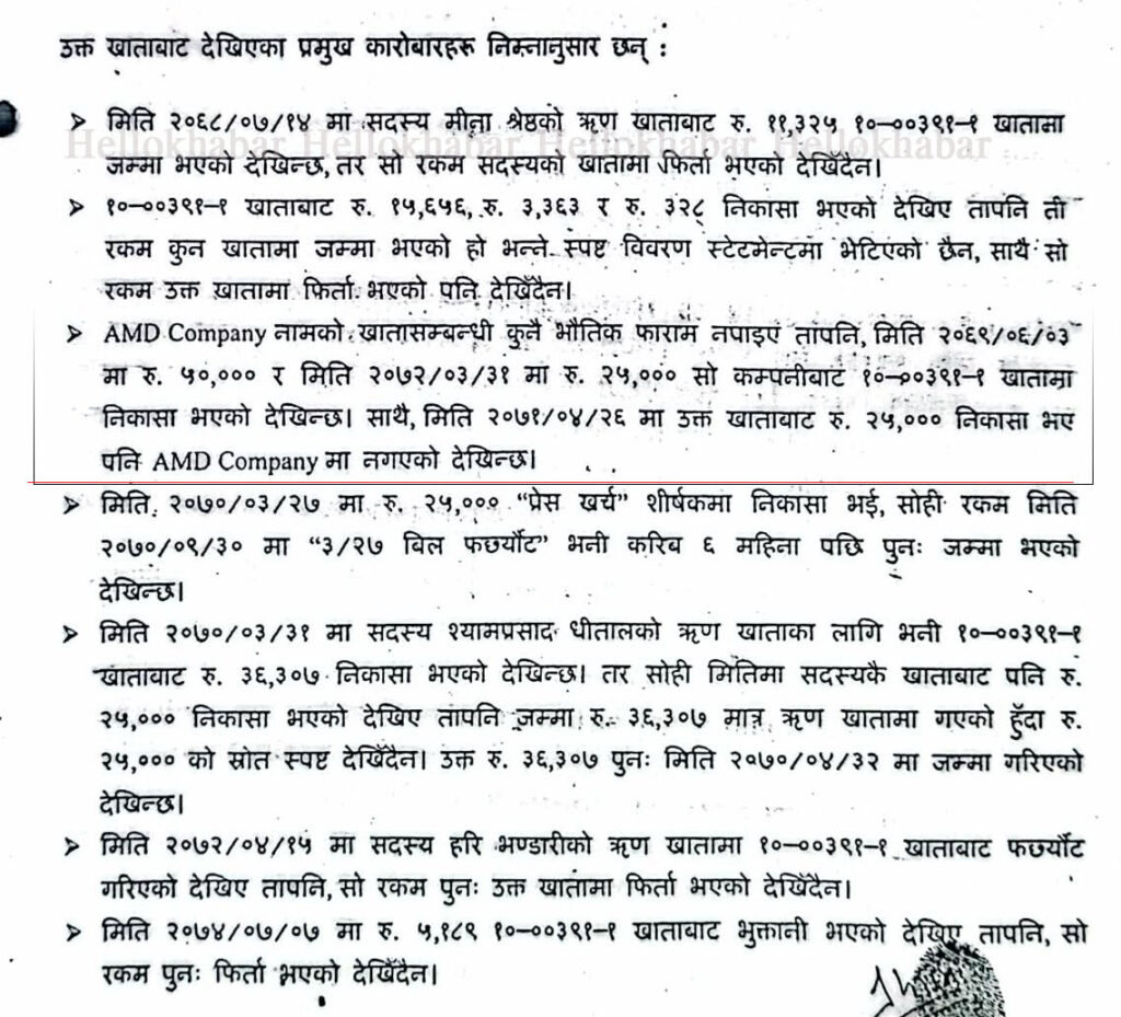 तत्कालिन व्यवस्थापक श्रृष्टि श्रेष्ठले संस्थाको विषयमा अध्ययन गरी २०८२ पुष ७ गते अध्यक्षलाई बुझाएको प्रतिवेदनमा एएमडी कम्पनी नामको खाता सम्बन्धी कुनै पनि भौतिक फारम नै नभेटिएको उल्लेख छ । तर, सोही कम्पनीमा मिति २०६९/६/०३ मा ५० हजार, २०७१/४/२६ गते २५ हजार र २०७२/३/३१ मा २५ हजार रुपैयाँ व्यवस्थापकको लागि खोलिएको १० नम्बर खातामा निकासा गरेपछि पुनः त्यो कम्पनीमा रकम फिर्ता नभएको प्रतिवेदनमा उल्लेख छ ।