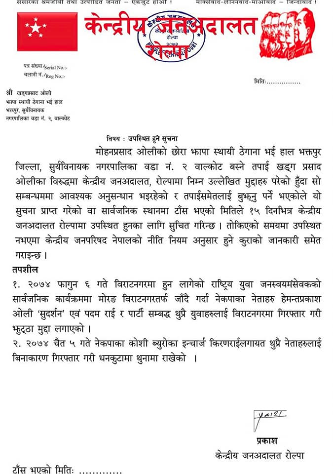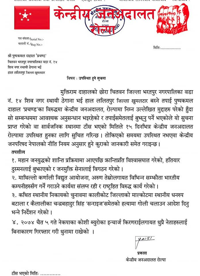 पार्टीको रोल्पामा रहेको ‘जनअदालत’ का प्रकाशको नामबाट जारी गरि पूर्जीमा १५ दिनभित्र केन्द्रीय जनअदालत रोल्पामा उपस्थित हुन उर्दी जारी गरिएको छ ।