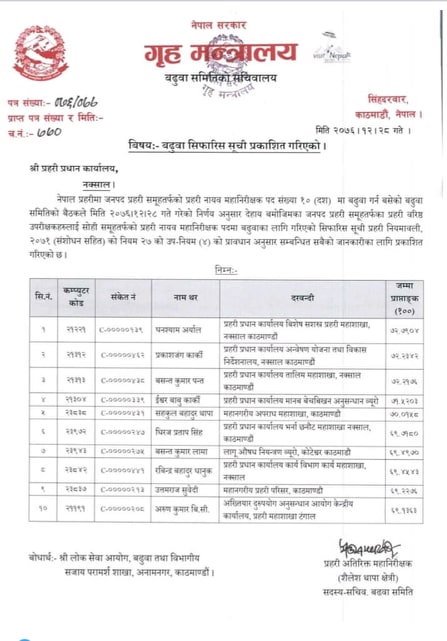 डीआईजीको लागि ३४ एसएसपी प्रतिस्पर्धामा थिए। सुची अनुसार एसएसपीहरु घनश्याम अर्याल, प्रकाशजंग कार्की, ईश्वरबाबु कार्की, बसन्त पन्त, सहकुल थापा, धिरज प्रताप सिंह, बसन्त लामा, उत्तम सुबेदी, रबिन्द्र धानुक र अरुण विसी डीआईजी बढुवामा सिफारिस भएका छन् ।
