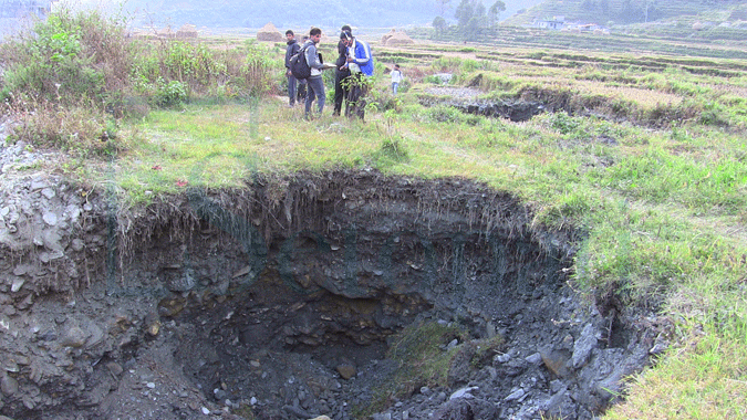 अर्मलामा क्षेत्रमा जमिन भासिएर ठूलो-ठूलो खाल्टो खेतका गह्राहरुमा खाल्डाहरु देखा परिरहेकोले त्यस वरपरमा स्थानका स्थानियवासी त्रसित भएका हुन।