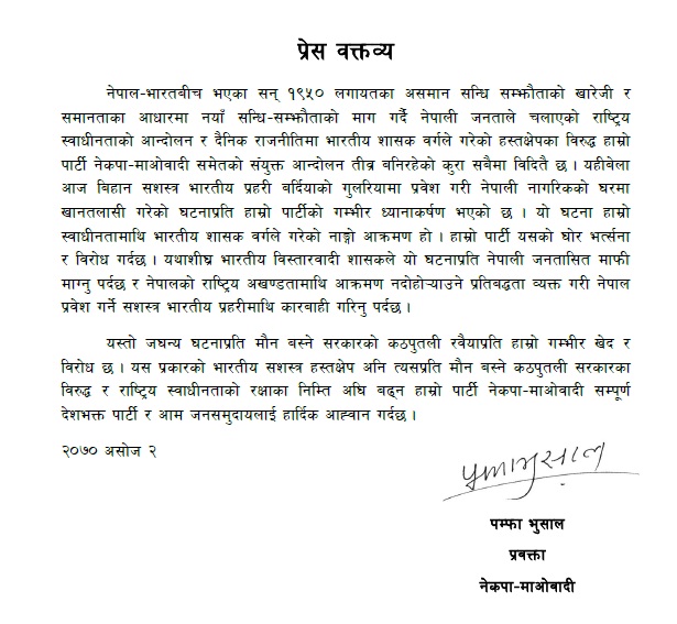 पार्टी प्रवक्ता पम्फा भुसालद्धारा जारी गरिएको प्रेस विज्ञप्तिमा भारतीय पक्षले तत्काल नेपाली जनतासित माफी माग्न तथा नेपालको राष्ट्रिय अखण्डतामाथि आक्रमण नदोहो¥याउने प्रतिबद्धता व्यक्त गरी नेपाल प्रवेश गर्ने सशस्त्र भारतीय प्रहरीमाथि कारबाही गर्न माग गरिएको छ ।