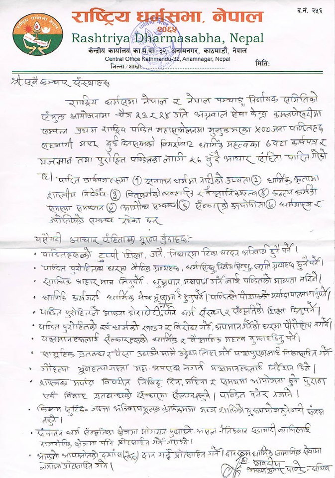 काठमाडौंमा भएको प्रथम राष्ट्रिय पण्डित सम्मलेनले पण्डित तथा पुरोहितहरुको लागि आचारसंहिता तयार पार्दै यस्तो नियम बनाएको हो ।